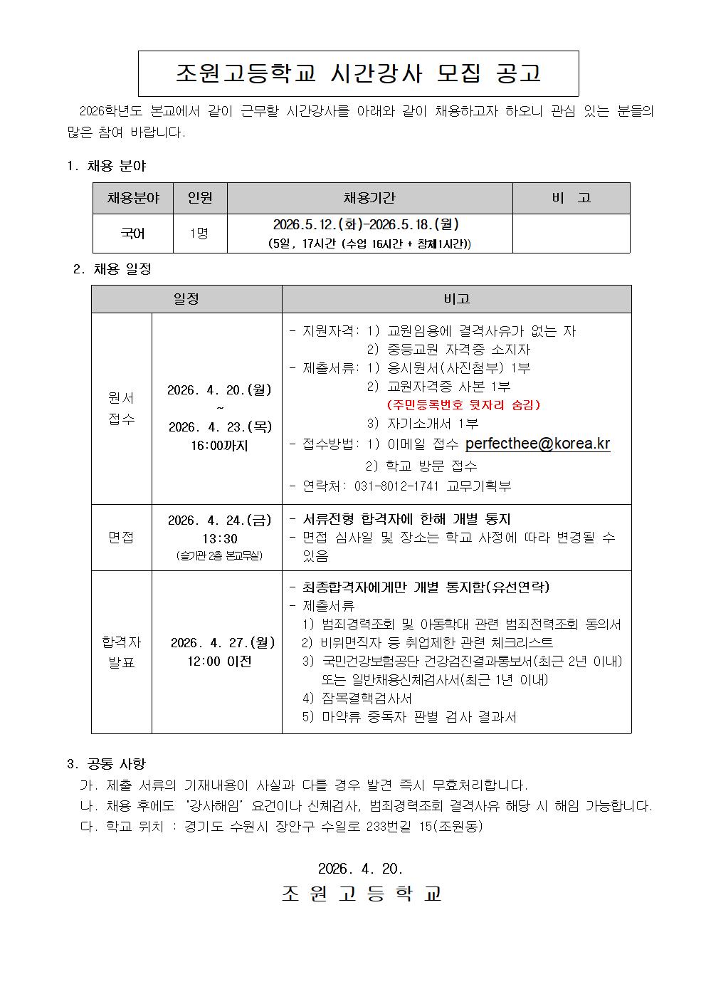 조원고등학교 국어 시간강사 급구