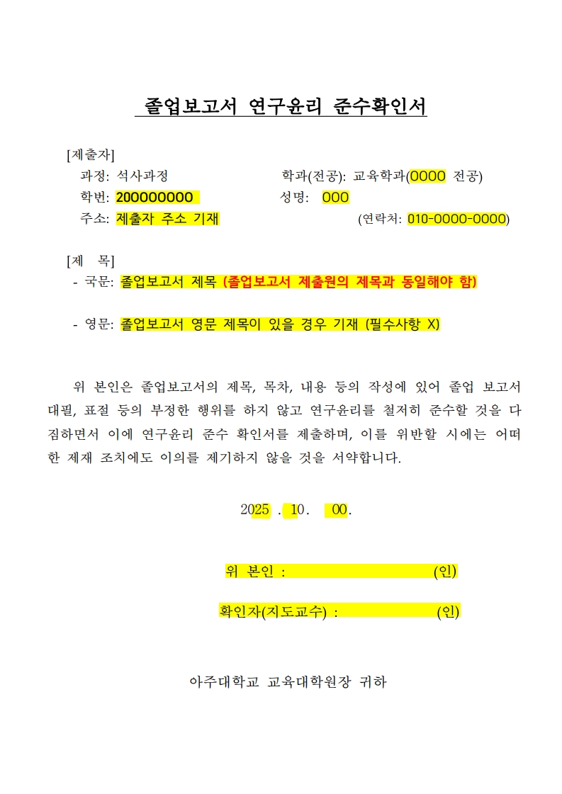1) 본인, 지도교수, 주임교수의 서명이 완료된 서류를 이메일(edu@ajou.ac.kr)로 제출(pdf) / 전자서명 가능 (전자서명 삽입 시, 서명 뒤 배경 제거 필수)
