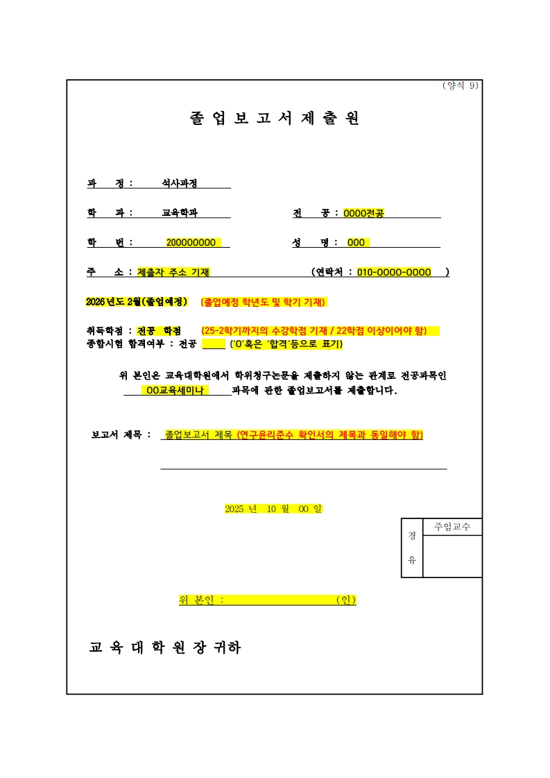 1) 졸업보고서 제출원 1부 (양식9, 첨부파일 참조)
