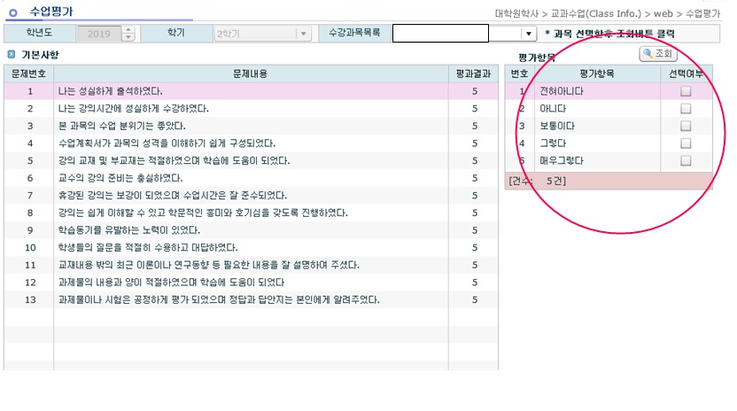 아래와 같은 화면을 통해 수업 평가가 진행되며 평가 항목은 1~5점 척도로