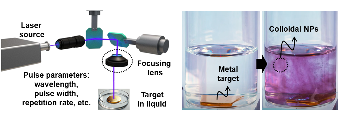 Laser ablation in liquids process (left) and actual formation of nanoparticles (right)