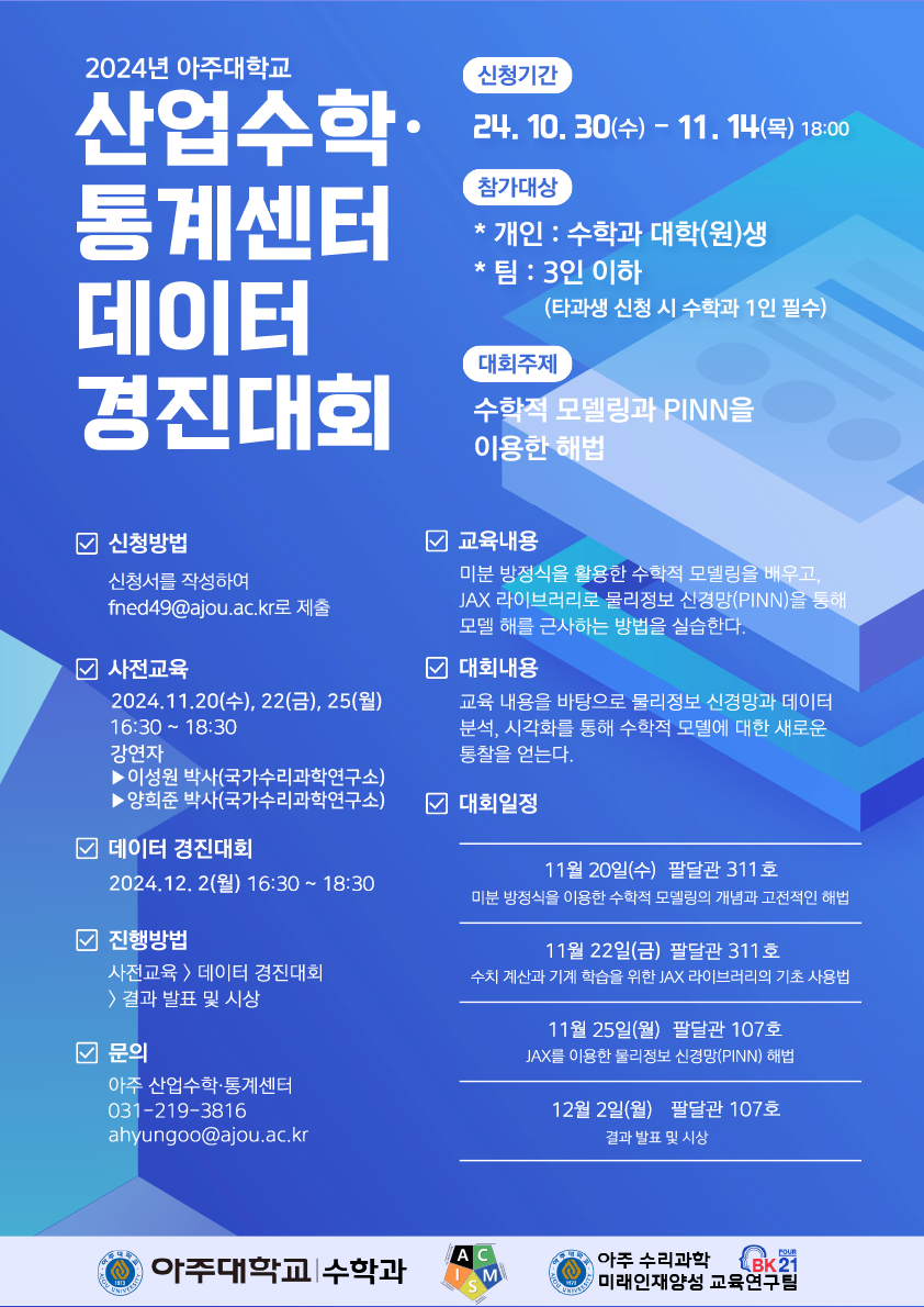 [일정 변경 공지] 2024년 아주대학교 산업수학·통계센터(ACMSI) 데이터 경진대회 안내(접수기간 ~ 11/14(목)까지)